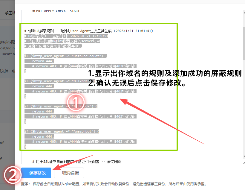 - 通过宝塔防火墙或配置文件,批量封锁恶意IP段和UA。
