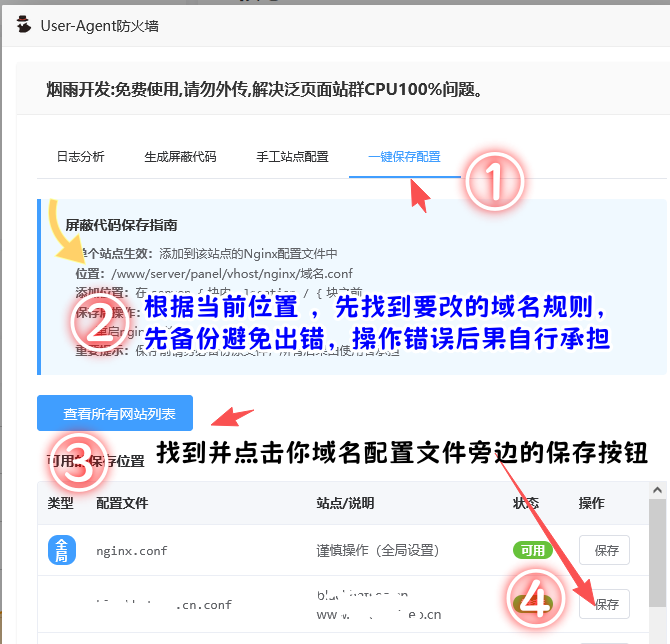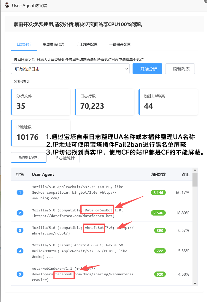 原创作品来自烟雨唯一联系QQ:81047380 微信号:yanyuseo 未经允许,不得转载。:烟雨黑帽SEO » 宝塔面板使用蜘蛛池泛目录站群造成cpu使用率100%的解决办法【User-Agent过滤工具篇】