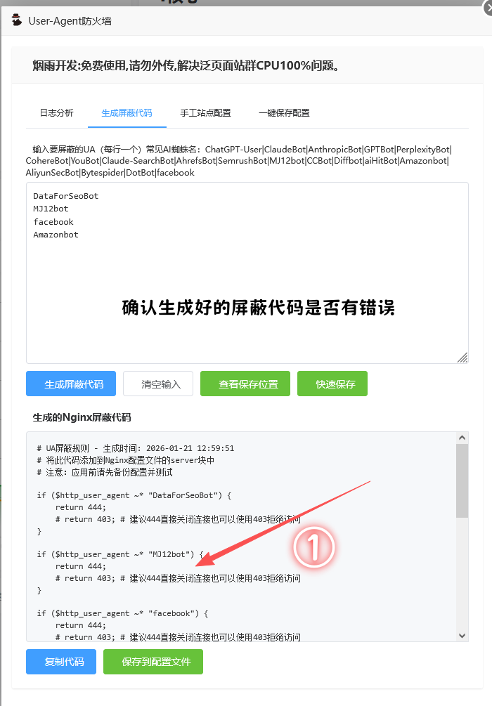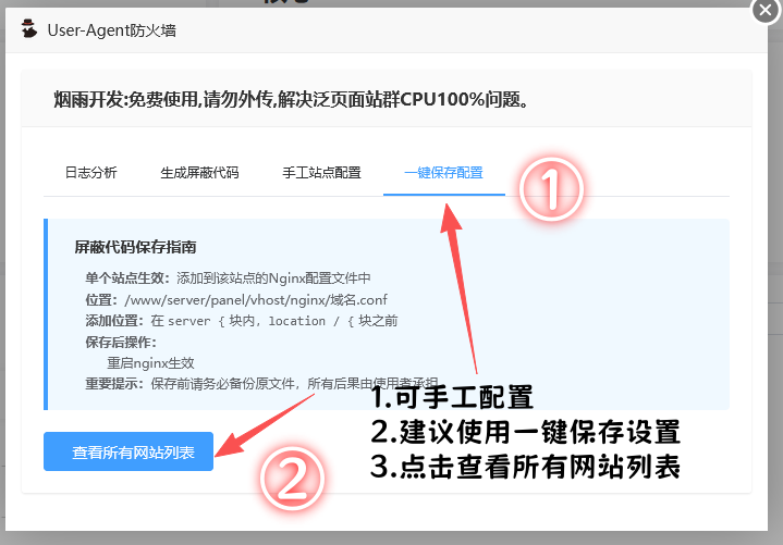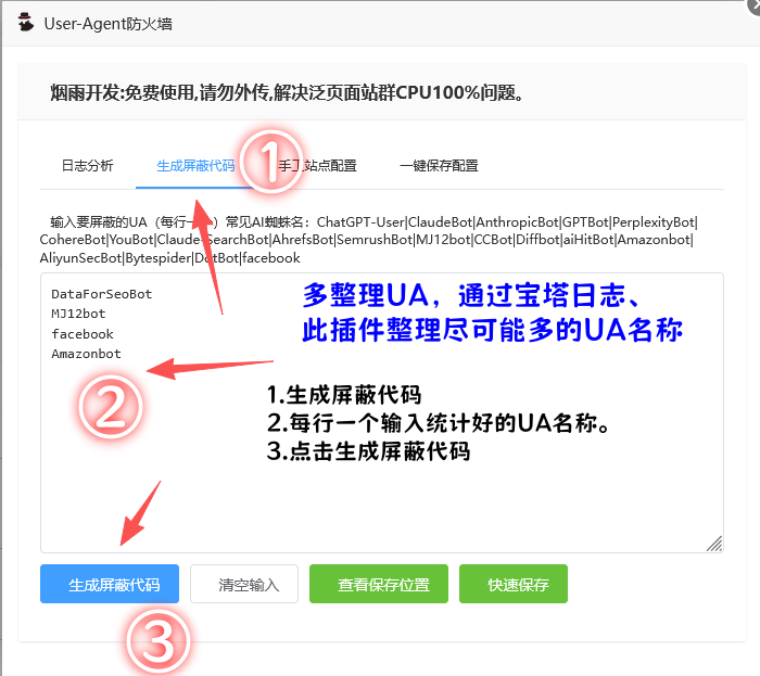 为了方便操作,给客户免费开发一款宝塔 nginx环境防护插件,用于批量扫描日志里出现的蜘蛛User-agent 以及自动生成屏蔽规则,和一键添加到站点配置规则里。